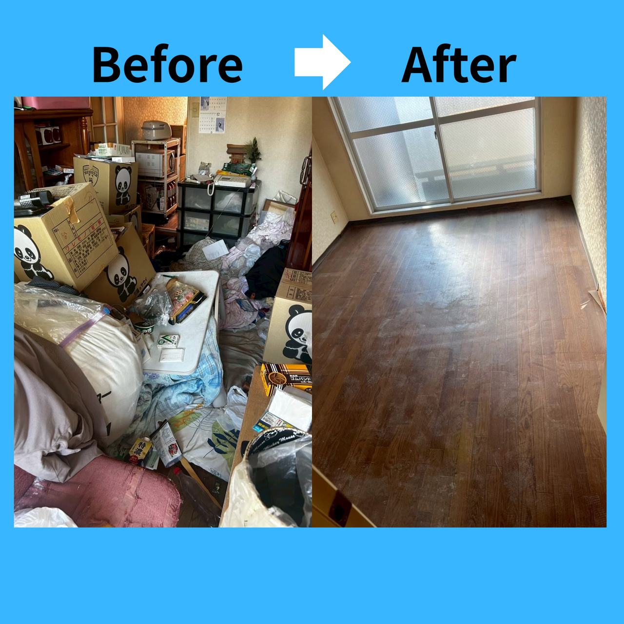 すべての家財を撤去した後は、床面の簡易清掃を実施。長年の埃や汚れを取り除き、ご依頼主様に大変満足いただけました。